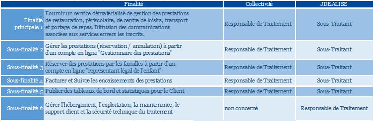• JDEALISE, gère des données à caractère personnel pour des raisons de gestion et sécurité, son représentant est le Président de JDEALISE. Pour toutes les autres finalités JDEALISE et les distributeurs de la solution sont sous-traitants directs ou indirects des collectivités, associations ou SIVU. JDEALISE ne gère pas directement les données des parents qui utilisent les services en ligne.